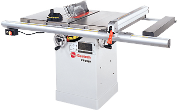 Geetech 10" Tilting Arbor Saw is designed and manufactured for precision, performance and economy, combined with Geetech's reputation for quality. It is carefully designed to integrate many improved and fine features, making it the first choice for those who require a high quality saw with a lower cost. Quality features included are: Precision fence features self-alignment for accurate parallelism to saw blade Solid table extensions are standard High quality 10" T.C.T. blade included Table is milled with two T-slots Quick setting miter gauge included Key type ON/OFF switch See-thru blade guard Three wheels provide convenient mobility Large angle scale for easy reading Cast iron table is precision ground |