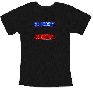 Features: 1) Fully programmable: no cords, no wires, no software needed 2) LED: 7 x 21 dot matrix 3) Memory: up to 6 messages, the first location can hold 512 characters, and message locations 2-6 store up 256 characters each 4) Messages automatically stored when switched off 5) 9 Levels of scrolling speed, and brightness 6) Power supply: CR2032 button battery 7) Color can be available: red, blue, jade green, amber, pink and white color 8) 100% cotton washable t-shirts, 190g/sqm with high quality
