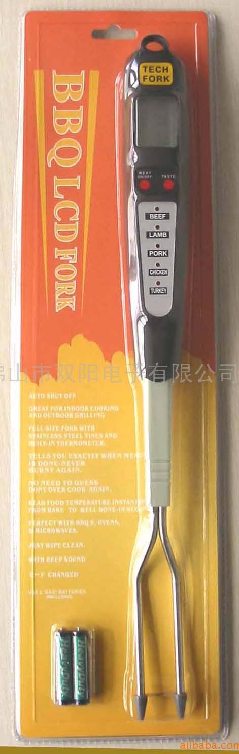 ITEM: Temperature Fork with LCD MODEL: S-220 SPECIFICATION: *Electric power: auto shut-off . *With liquid crystal display on screen and beep sound . *Great for beef, lamb, pork, chicken, turkey indoor cooking and outdoor grilling. *Rubberized grip. *With readable air temperature. *Full size fork with stainless steel tines and built-in thermometer. *Tells you exactly when meat is dome-never burn another steak or undercook chicken again. *No need to guess-don't over cook again. *Read food temperature instantly from rare to well done-in seconds . *Perfect with BBQ's, ovens & microwaves. *Just wipe clean. *With beep sound . *Also can be used to read air temperature . *Attached temperature chart for every kind of meat. *Including two AAA batteries. *Size: 42cm long . *CE approval. PACKAGE: *Inner Box:47*28*14.5 CM(12PCS/BOX) *Carton Size:48*29*45 CM(3BOX/CTN) *G.W.:8.5 KGS *N.W.:6.5 KGS