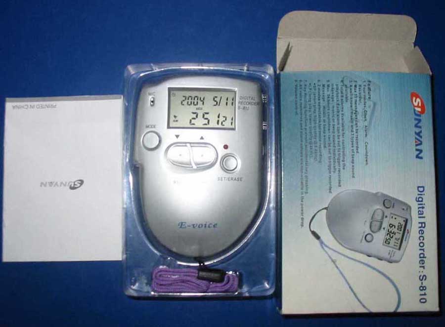 ITEM: Digital recorder MODEL: S-810 / S-810A DESCRIPTION: * Four modes : ClockĦBAlarmĦBCountdownĦBRecorder(Recording time 8, 16 min). *Maximum 15 messages can be recorded. Each message can be erased, recorded and played individually. Total duration is 8 minutes. *4 well-known music and 3 types of beep sound available. *Total 6 alarms available. Each alarm can be set to trigger recorded message, music or beep sound individually. *A maximum 24 hours countdown can be set to trigger recorded message, music or beep sound. *2 modes selectable for voice recording: P SP (short play, high quality @6.4kHz, 5 or 8 minutes duration). P LP (long play, lower quality @4kHz, 8 or 16 minutes duration). *Key-holding function prevent accidental key pressing. *All message memories and alarm setups are non-volatile in the power drop. *Volume control. PACKAGE: *Carton Size:43.5*27*18.5 CM(60PCS/CTN) *G.W.:6 KGS *N.W.:5.5 KGS