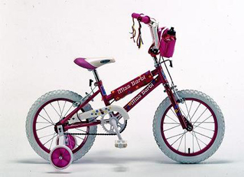 STEEL SLOOPING FRAME & BMX FORK STEEL PAINTED WHITE HANDLEBAR, C.P. 4-BOLTED STEM, STEEL HEAD PARTS, F TYPE PLASTIC WHITE CHAINGUARD STALIZERS WHITE/PINK COVER W/STEEL STAYS 14*1.75 WHITE TIRES, PINK PAINTED STEEL RIMS TWO TONE WHITE/PINK SADDLE, 3PCS PADS WITH BOTTLE & FRONT BAG ON HANDELAR