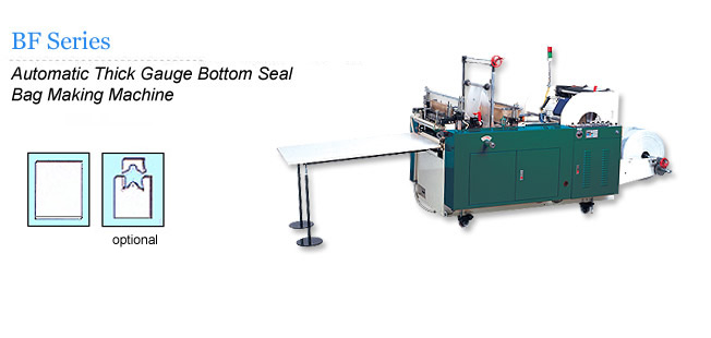 | This BF series of machines are designed for producing a wide variety of thin and thick gauge flat bags, vest bags and perforated bags. The machines perform bottom seal/cut and come with hot pins for stacking functions. When required, the outfeed end may be fitted with a conveyor belt for fully automatic operations, and convenient, efficient bag collection. |