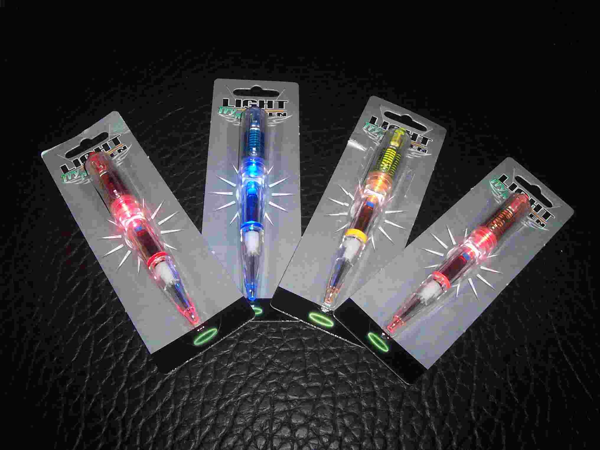 For writing and light up your mood at dark. Color : Red, Orange, Green, Blue Battery : 2*AG13 Customer's logo are accepted. Packing : 1pcs/Blister card, 288pcs/carton (G.W 12KG)