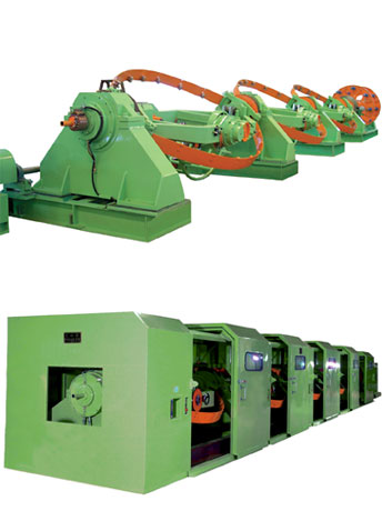 4-5 cores bow type cable laying up machine Skip type 4-5 core PVC round type control cable and power cable high speed laying up with back twist, most useful for mass production with highest efficiency. Using dual wheel capstan for medium size of cable high speed twist, or caterpillar for large size of power cable laying up. Main rotor and capstan wheel/caterpillar are driven by individual motors. MMI +PLC computer control of laying pitch pre-setting and speed synchronize control. |
