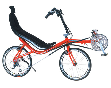 Item No.: FL-RC20 Model : 20¡¨ 27-SPEED RECUMBENT BIKE Frame: 20¡¨ ALUMINUM ALLOY 7005 Fork: FULL CR-MOLY Stem: UPWARD/DOWNWARD ADJUSTABLE HANDLEBAR STEM Tire: KENDA 20¡¨x1.25" Shifter/Freewheel: SRAM ATTACK 9-SPD Gear system: F/D - SHIMANO 105; R/D - SHIMANO XT FOR 9-SPD Brake system: AVID DIGIT 5/FR 5 Seat: FRP W/HEAD REST |
