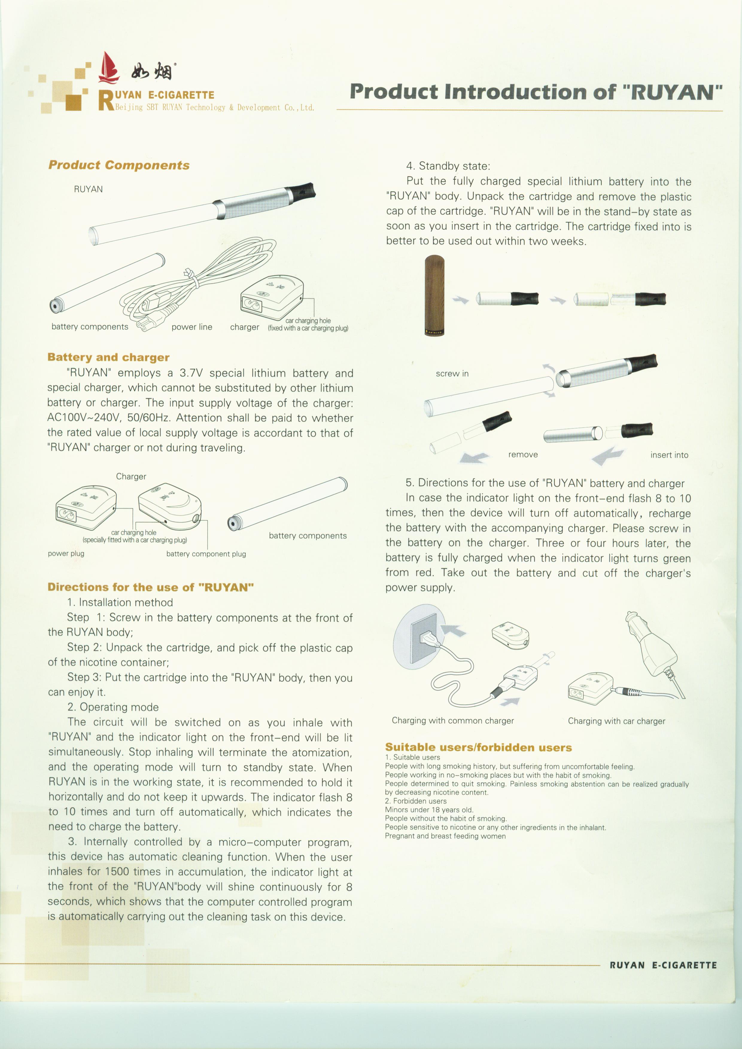 The underneath is one type e-cigarette product for representative in our offer: 1Product: "RUYAN" Electronics cigarette( cigarette type V8, white) .Specification: 6*8*18cm/pcs Package: 10pcs/box Shipment:by sea or by Airplane Minimum order form:50pcs