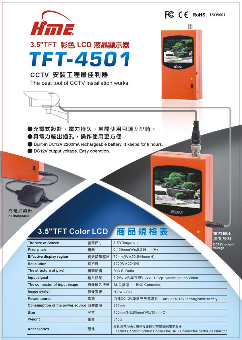 TFT-4501 LCD testing monitor ¡V Rechargeable batteries & 12VDC output voltage 1.The size of screen: 3.5¡¨ (Diagonal) 2.Pixel pitch:0.150mm(W)X0.216mm(H) 3.The effective display region:72mm(W)X50.544mm(H) 4.Resolution:960(W)X234(H) 5.The structure of pixel: R.G.B. Delta 6.Input signal:1.0Vp-p Combination Video 7.BNC Connector 8.NTSC/PAL 9. Built-in DC12V 2200mA rechargeable battery 10. 12VDC input output voltage support cameras to test the function. 11.Consumption of power source:130mA 12.Size:150mm(H)X85mm(W)X35mm(D) 13.Weight: 510g 14.with leather belt and bag, Video connector, BNC connector, batteries charger 15.ISO9001, CE, FCC, REACH and RoHS certified.