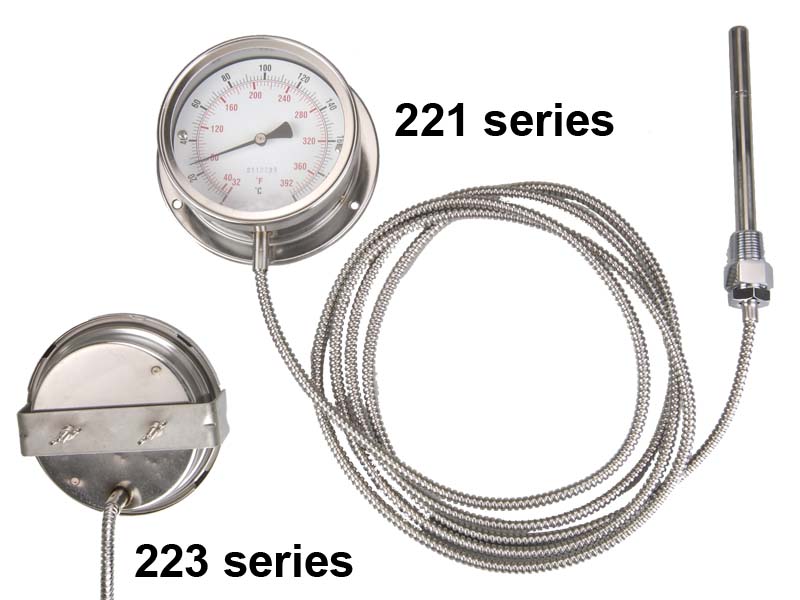 Mounting: Wall mounting Type ; panel mounting type Dial diameter: 3" ; 4" ; 6" Case: Stainless steel 304 case, IP65 Lens: Glass lens Dial: Aluminum Pointer: Aluminum, black Measuring principle: Mercury expansion system standard Gas expansion system available ( Particularly for food industry) Capillary: Standard 3 meters length, stainless steel 304 Other length available by order, max. 20 meters length Connection: Male swivel nut 1/2¡¨PF with removable male thread 1/2¡¨PT or 3/4¡¨PT Stem: Stainless steel 304 or 316 Stem Length: 6" standard, other sizes available by order Stem Diameter: 12mm standard¡F6.35mm, 8mm, 9.5mm available Accuracy: +/-1% F.S. Ranges: From -50 to +600 deg.C available Optional extras: Thermowell ; Electrical contacts
