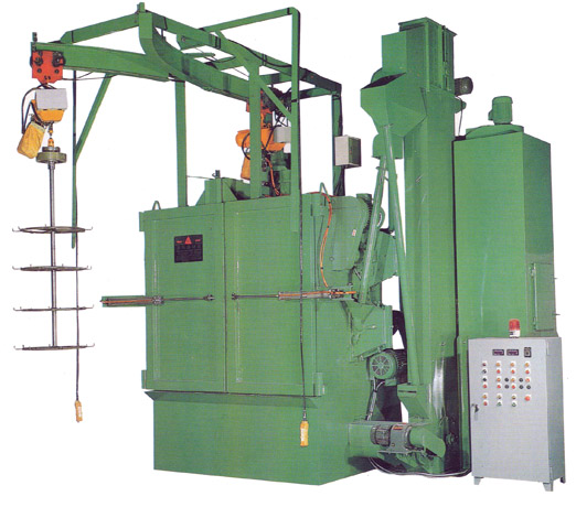 Model CH-103 Max. loading capacity 1000kg Max. load height 1600mm No. of shooting wheel 2 Shot blasting power7-1/ 2HP x 2 Hoist hang power 3HP x 2 Elevating shot power 1 HP Dust collecting power 3 HP N.W. 4200kg After the hanger moved to the dead position and then, the workpiece can be rotated selfnessively. Especially, the hanger can be moved forwardly & backwardly, so that, which can be developed the most blast effect.