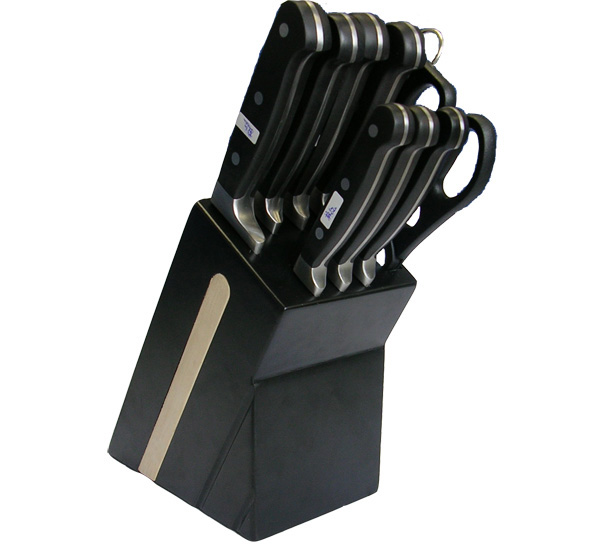 Includes:8"(20cm)kitchen knife,8"(20cm)bread knife,8"(20cm)meat knife,6"(16cm)boning knife,5"(13cm)utility knife,4"(10cm)paring knife,kitchen scissor,8"(20cm)knife sharpener,Block black.