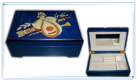 Prospectus : Blue jewelry box with velvet lined interior and musical installation.