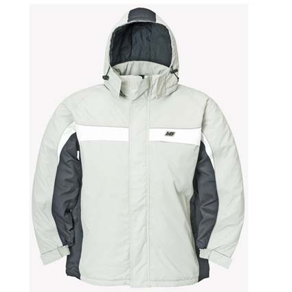 Outshell: nylon taslon with PU coating Lining: Mercerized jersey Padding: 140g/sqm polyester on body, 120g/sqm on sleeve, 80g. Sqm on hood