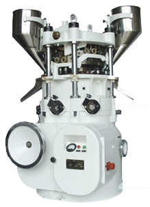 This machine is designed for pressing tablets from various kinds of granular materials.Beside round tablets the machine can press the tablets in different geometrical shape and impressed letters on both sides of the tablets.The mechanism of the machine belongs to double-press type,including two sets of feed assemblage and press-roller unit,The turret carries 25 sets of movable-punches and dies,so 50 tablets are produced by each revolution of the truuet totation.When round tablets are pressed,there are four sets of the punches and dies to choose.1-tablet mode of punch and die through 4 tablet mode of punch and die,The choice is dependent on the diameters of the tableted.So this machine is more suitable for mass production.When operated,the speed of the filling materials and the thickness of tablets are adjustable.A independent suction unit is attached to the machine.The residual powder during operation can be taken in by this suction unit through its nozzles and hoses.Thus the blockage by clustered powder is eliminated and the collected powder materials can be reused. |