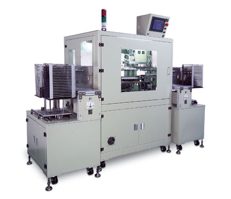 Thin carrier plate are loaded from loading cassette automatically. A robot hand pulls the plate into preparing position.