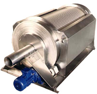 Cone screen is designed to remove suspended solids from a high solids loading slurry/sludge. The raw wastewater/sludge/slurry is fed from the center inlet and solids separation is achieved by rotating the cylindrical cone screen. Thickened sludge rolls out the end of the cone, while decanted supernatant flows through the screens. Features: