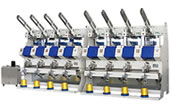 Features: Powerful Multi-function Auto bobbin feeder and doffing system Doffer automatic stops when bobbins run out. Mechanical system. No pneumatics, air quality, or air pressure to affect the service life and performance of the machine. Quick action, accurate timing, and durable. 7 second doffing time. Individual spindle control LCD display. Yarn length measured by computer, not rollers or wheels. Accuracy within 0.5%. Yarn speed adjustable from 300 to 1,600 meters/per minute. Uniform thread lubrication due to constant yarn speed. The oiling roller speed is adjustable and proportional to the yarn speed. Density adjustment with different yarn specifications. Automatic thread layer option. 250 sets of memory functions with production quantity preset. Drum thread-guidance system High speed, low noise drum. Drum with special hardened polish treatment, smooth & wear resist. Circulating oil system Centralized oil tank feeds 16 spindles. Spindle independent oil filter and filler for consistent trouble-free operation. Easy to clean, detachable filters. Oversized oil fenders and troughs to minimize oil loss and cleaning. Electro-magnetic tensioner Automatic tension release throughout the cycle for consistent winding tension. |