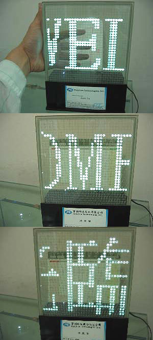 Polynano carbon nanotube field emission device (CNT-FED) features perfect flat outer screen surface, flat rear screen, very thin thickness, high beam current output of carbon Nanotube emission cathode, circle phosphor dot screen anode, monochrome output, see-through type , wide-environmental operation application. Monochrome display for 32x32 resolution character and image interface application