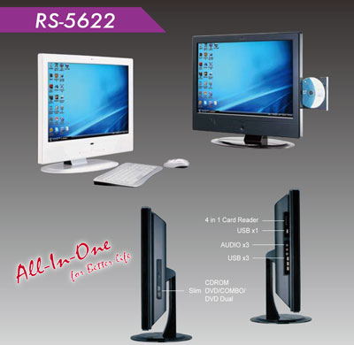 CPU: Intel Core 2 Quad / Core 2 Duo / Dual-core / Pentium D / Pentium 4 /Celeron. LGA775 533/800/1066 FSB (Don't support Intel Pentium Processor Extreme Edition) Chipset: North Bridge Intel Q965 Express Chipset South Bridge Intel ICH8 Memory: 2x DDR II DIMM memory slots (supports up to 4GB memory) Supports 1.8V DDR II DIMM Supports dual channel DDRII 800/667/533 DIMM HDD: 3.5" size SATA2 (Up to 500GB or above) Optical Device: Slim CDROM / DVDROM /Combo (DVD+CDRW) / DVD RW Display Resolution: 22" TFT LCD (WXGA 1680x1050) Expansion Slots: 2x mini PCI slot (internal slot) Audio: Built-in 2x speakers (3W) Intel ICH8 integrated with Realtek ALC888 HD Audio LAN: Marvell 88E8053 controller supporting 10/100/1000 BASE-T Ethernet USB Port: Max 10x USB 2.0 ports VGA Port: Intel Q965 built in experience superior graphics with intel GMA3000, up to 384MB shared with system memory Multi-Media Card Reader : SD / MS / MMC Back Panel I/O Ports: 1x Power Connector 1x PS/2 Keyboard 1x PS/2 Mouse 1x RJ45 2x USB 2.0 1x Serial 1x VGA 1x RCA (TV Cable)