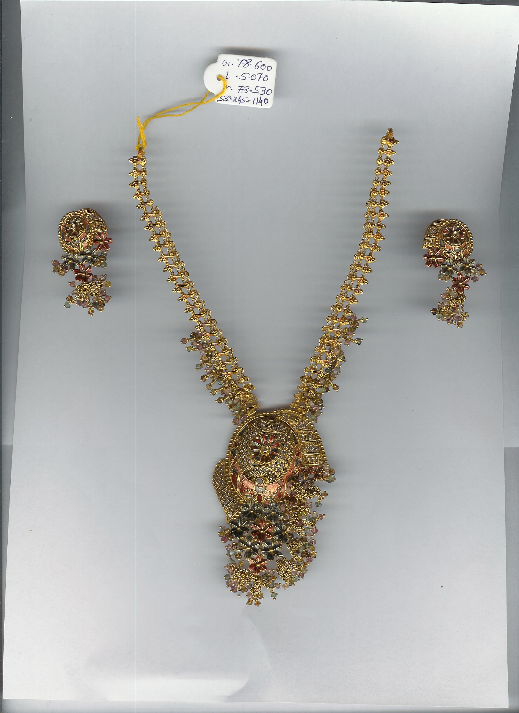 91.6 fine hall marked necklace with intricate craft work done by the seasoned artisans, semi-precious and imitation coloured jem stones are used in between the antique work. styled as if, looks like as age old royal jewelry designs.
