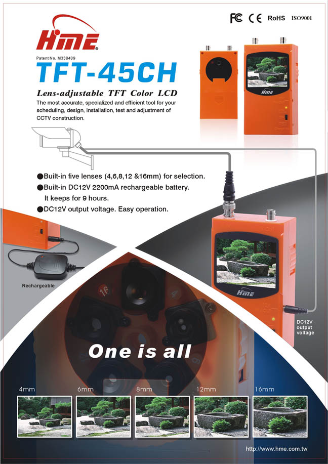 TFT-45CH LCD testing monitor ¡V Rechargeable batteries & 12VDC output voltage 1.1/3¡¨ Panasonic Color CCD sensor 2.Number of Pixel: 512(H) x 492(V) ¡ÕNTSC¡Ö;512(H) x 582(V) ¡ÕPAL¡Ö 3.Resolution: 420 TV lines 4.Min. Illumination: 0.5Lux / F2.0 5.S/N Ratio: More than 48db(AGC off) 6.Electronic Shutter: 1/60(1/50) to 1/100,000 sec 7.Lens: Built in 4, 6, 8, 12, 16mm 8.The size of screen: 3.5¡¨ (Diagonal) 9.Pixel pitch:0.150mm(W)X0.216mm(H) 10.The effective display region:72mm(W)X50.544mm(H) 11.Input signal:1.0Vp-p Combination Video 12.BNC Connector 13.NTSC/PAL 14.Built-in DC12V 2200mA rechargeable battery. 15.12VDC input output voltage support cameras to test the function. 16.Size: 155mm(H)x87mm(W)x48mm(D) 17.Weight: 670g 18.with Leather Bag/Belt/Video Connector/ BNC Connector/ three port power cable/batteries charger 19.ISO9001, CE, FCC, REACH and RoHS certified. Applicable for: Before design of CCTV- TFT-45CH provides multiple choices of the view as well as confirmation on the selection of needed lens, which avoids wasting unnecessary construction procedure and elevates the efficiency. After installation- 1. TFT-45CH can test cameras' operating effect and precisely adjust the angles of view. 2. DC12V output voltage support cameras to test the function.