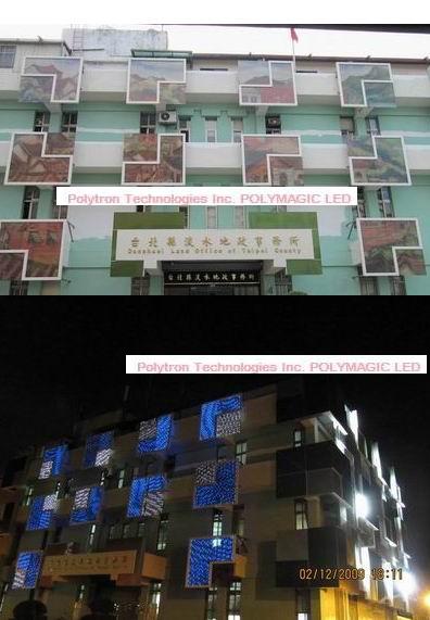 The world leading electronic and vision glass supplier, Polytron Technologies,Inc finished POLYMAGIC?LED image glass order which has installed in Tamshui, Taiwan this November. It is the government building project and totally installed 20 pieces of LED image glass on the outer wall of the building, for 10 outer lighting unit. The special designed lighting unit consist of two parts, one is an L sharp LED glass contributed hundreds of blue LEDs, the other part is an square sharp LED glass to consist with the L sharp glass as an whole big square lighting wall. Total size of this lighting unit is up to 3m x 3m.
