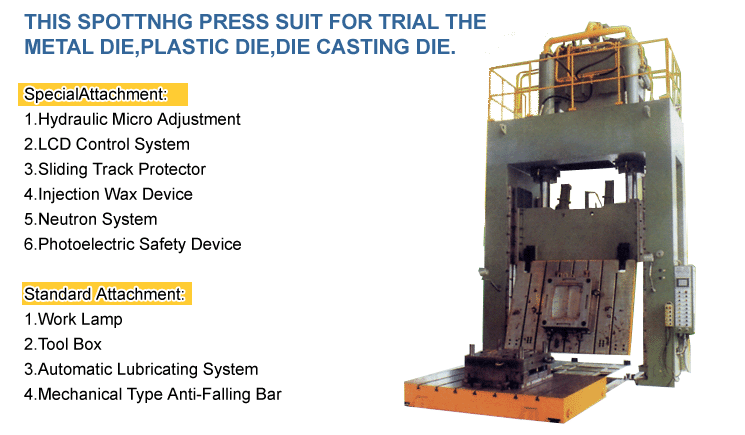 PRESSURIZING CAPACITY (ton) 100 200 300 RAISING CAPACITY (ton) 40 47 55 SLIDE STROKE (mm) 1200 1800 2500/3000 OPEN HEIGHT DAYLIGHT(mm) 1200 1800 2500/3000 SLIDE AREA (mm) 1300*1000 2000*1500 3000*2000 BOLSTER AREA (mm) 1300*1000 2000*1500 3000*2000 SLIDE LOWERING VELOCITY mm/sec 70-100 130 130 SLIDE SLOW DOWN VELOCITY mm/sec 5-20 5-20 5-20 SLIDE RAISING VELOCITY mm/sec 60 135 135 SLIDE SLOW UP VELOCITY mm/sec 5-15 15-60 15-60 TURN REVERSE 180 180 180 MOTOR 10HP 40HP 60HP |