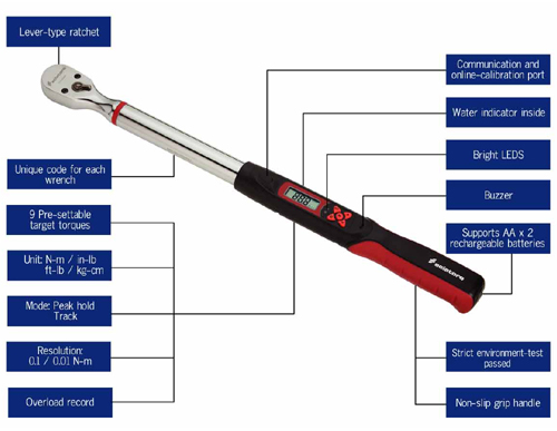 Main Features Standard functions including torque setting, unit setting, mode setting, and online calibration. Functions in both clockwise and anticlockwise directions. LCD display showing N-m, ft-lb, in-lb and kg-cm measurements. Audible and visible torque confirmation by means of buzzer and side LED display. Easy to set-up per application.