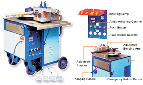 With the most advanced microcomputer, the machine can set with 4 different bending angles and control it precisely and accurately. 2. The manipulator on machine not only could adjust the angles itself, but also could present the huge crooked ¡§R¡¨. 3. According to size and quantity of rebar to be bent, the machine could be adjusted to optimal bending speed to reduce the damaged work and save operation time. 4. Special design for easy and convenient operation. 5. Equipped with 2 sets of emergent backward buttons for operation safety and reliability.