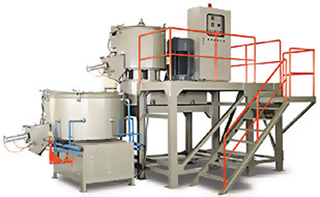 FEATURES: Two section mixers. the first section uses heated-oil for fusion material. The second section uses water for cooling the heating material. With the machine frame trestling the mixer, the unit is easy to feed. |
