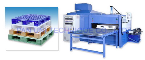 The machine is designed for welding large-sized PP pallets. It is driven by oil pressure and air pressure. The pallet welded by the machine is against striking and pulling. Features: 1. The templates are driven by four chromate treated steel rods and sleeve bearings which run smooth and precise 2. The specially designed thermal mould makes welding beautiful and durable. 3. It is built thermostatic system with error 0.5oC 4. It is assembled with parts processed by CNC machine and both the horizontal and vertical can meet demands of high precision. 5. Automatic smoke collection installation. Type : PU-MH1600P Dimension : L4310 x W2500 x H2620 m/m Weight : Main machine 4500 kg, Feeder 500kg Power : 33KW . 220 / 380V x 3 . 50 / 60HZ Air Pressure : 5KG/ cm2 Capacity : 30~50 sec / 1 MOLD Application : Welding for PP Pallet Ranging from 1M x 1M to 2M x 2M